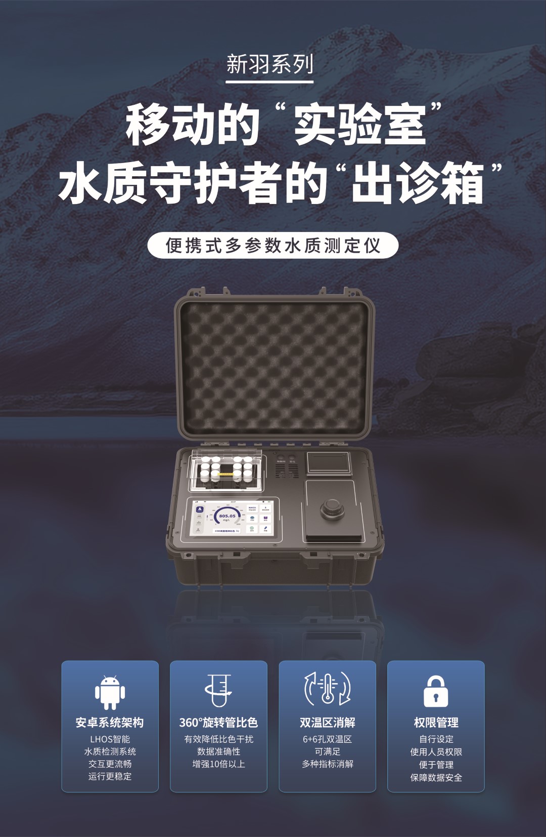 雙便攜箱設計,為戶外水質檢測提供了強大的戶外應用支持,該儀器具備雙溫區消解功能,6+6孔雙溫區設計,可以滿足多指標消解的需求。此外,儀器還內置了大容量鋰電池,綜合工況下工作續航能力長達8小時,為戶外長時間使用提供了強有力的支持。