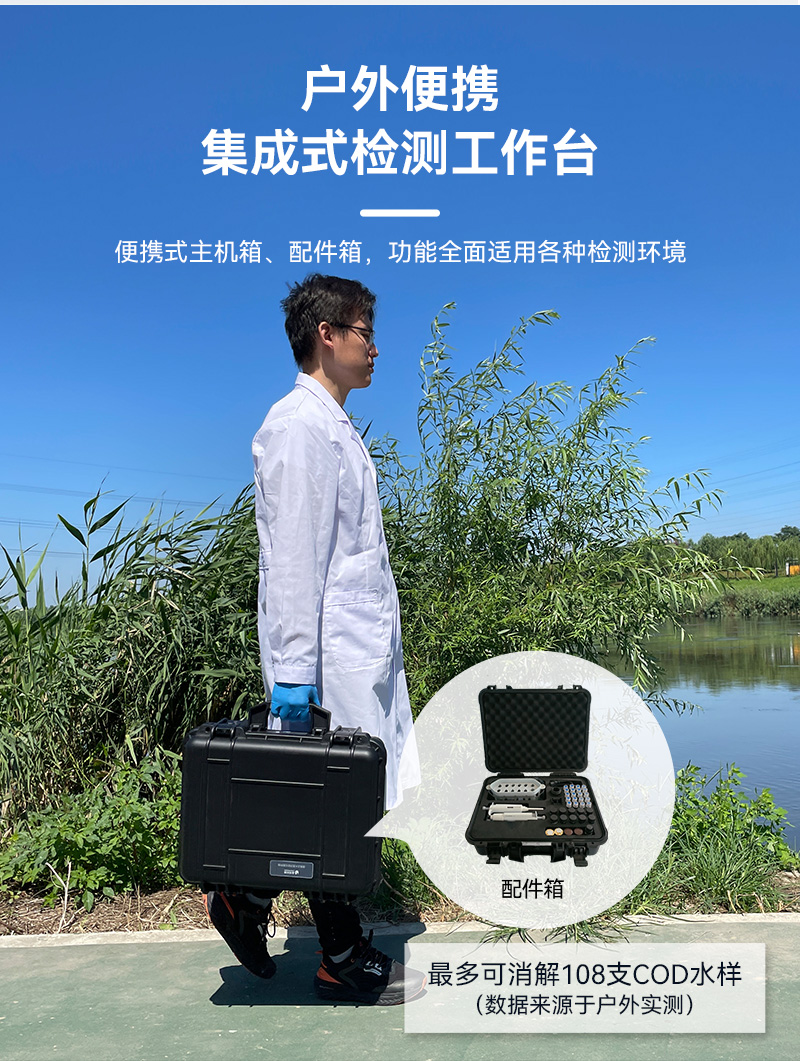 光源的持久耐用也是LH-C600的一大亮點。內置8個可見光波長LED光源,壽命長、更穩定且故障率更低,大幅降低了使用和維護成本。同時,戶外檢測便攜性也是該儀器的一大優勢。采用主機箱+配件箱的形式,耗材、配件完備,戶外檢測方便快捷。大容量鋰電池更是確保了儀器在戶外無電源條件下連續工作8小時以上的能力,讓水質檢測不再受地點和時間限制。