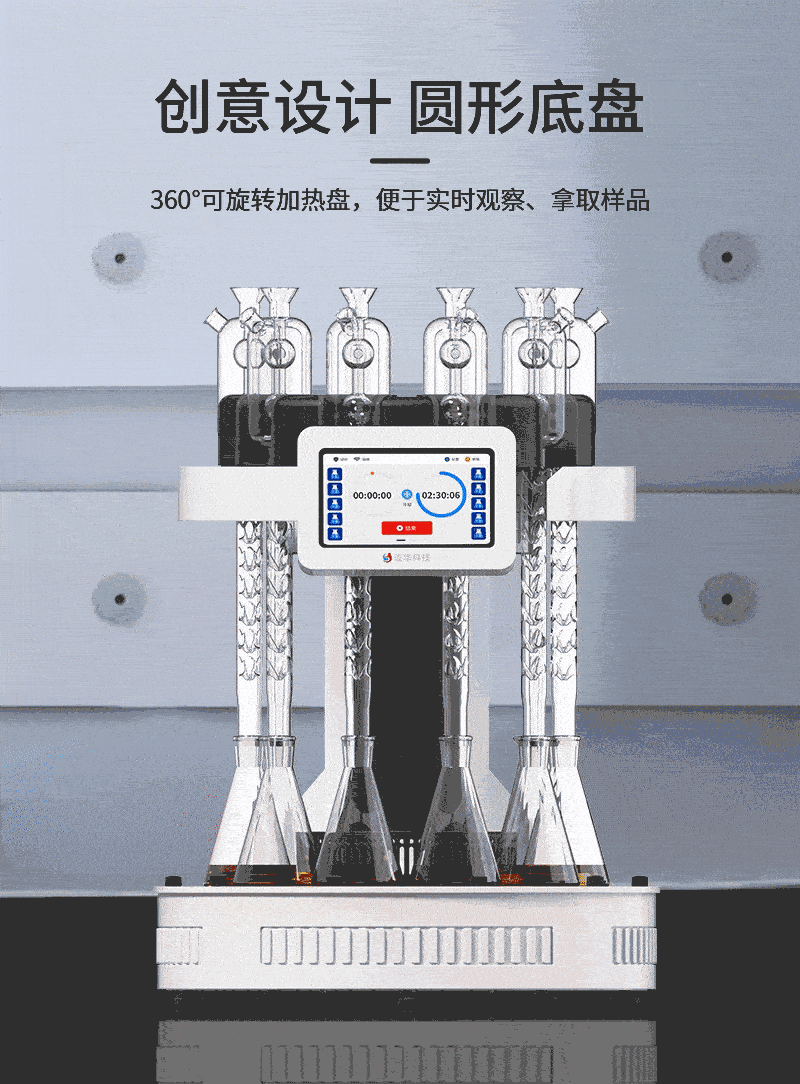 3、旋轉底盤:加熱盤采用左右可旋轉360°設計,便于用戶實時觀察樣品消解狀態,快速添加耗材、拿取樣品;